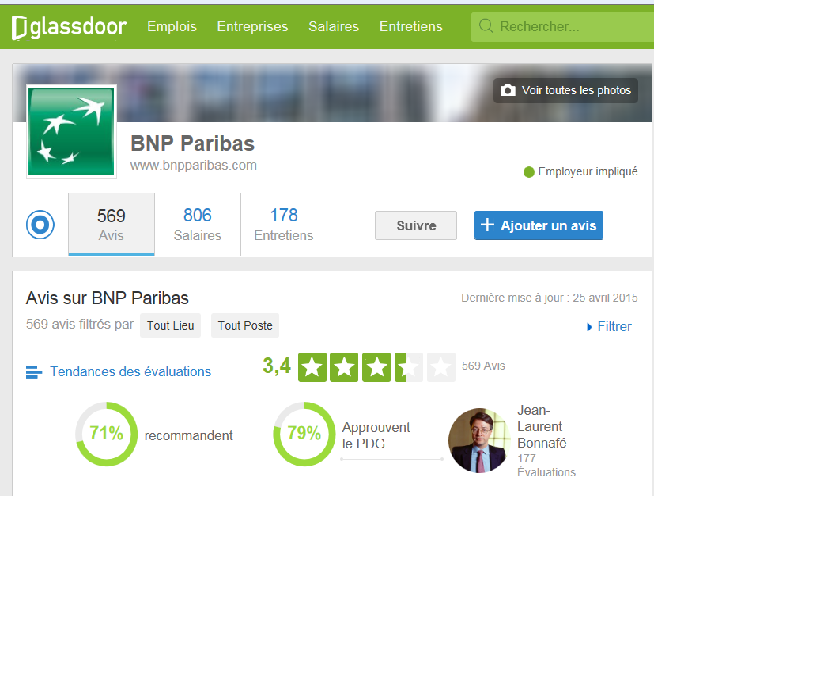 Ainsi, on constate que BNP Paribas obtient une moyenne de 3,4 / 5 quand la moyenne du site est de 3,3 / 5 (source Challenges).