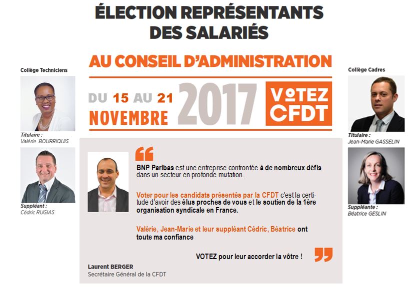 le mot de Laurent Berger : " BNP Paribas est une entreprise confrontée à de nombreux défis dans un secteur en profonde mutation. Voter pour les candidats présentés par la CFDT c'est la certi-tude d'avoir des élus proches de vous et le soutien de la 1ère organisation syndicale en France. Valérie, Jean-Marie et leur suppléant Cédric, Béatrice ont toute ma confiance